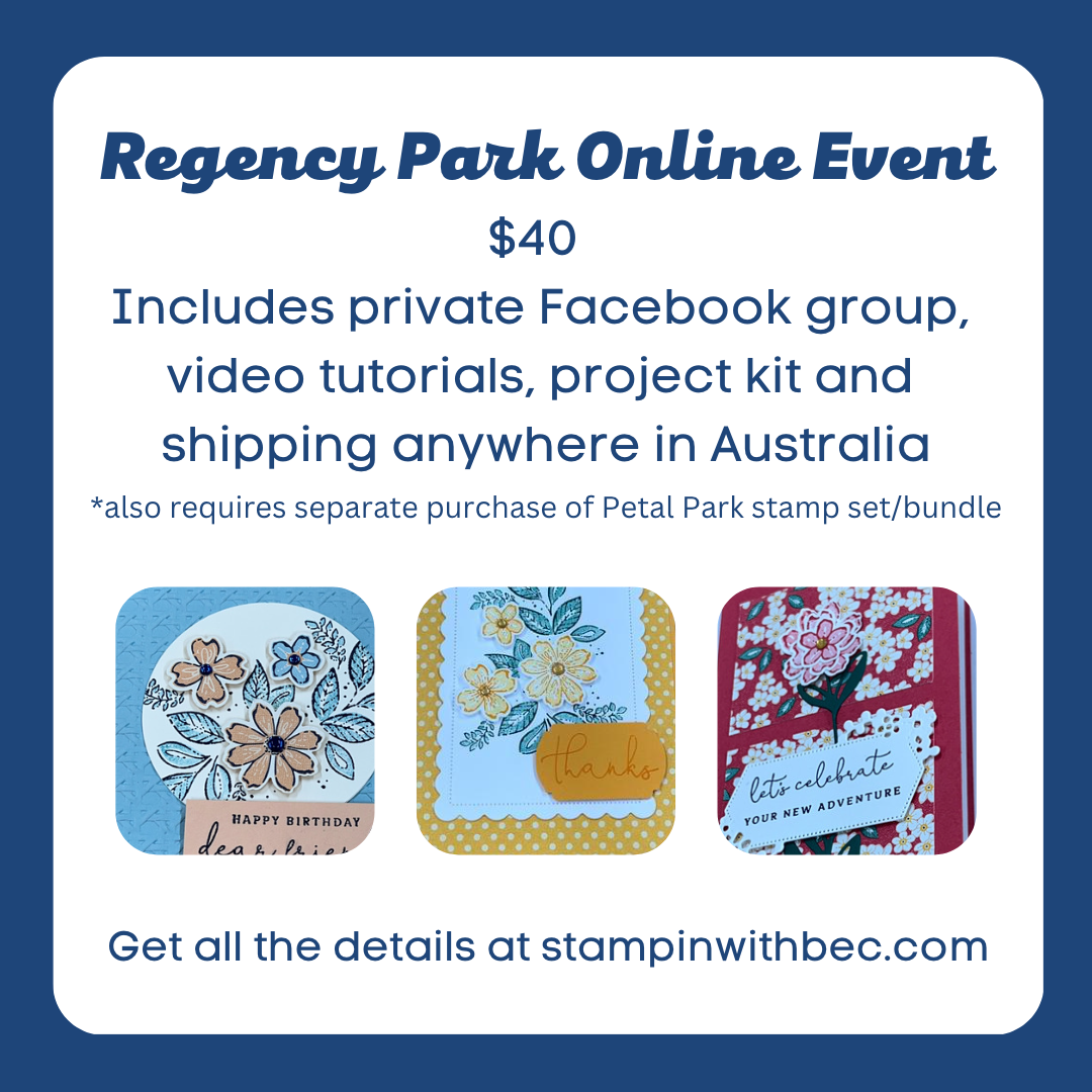 If you choose to book into this event you will receive your kit of materials in the mail. You'll also need to order the Petal Park stamp set or bundle to complete your projects. We will stamp along LIVE with you in the Facebook group. Fun!